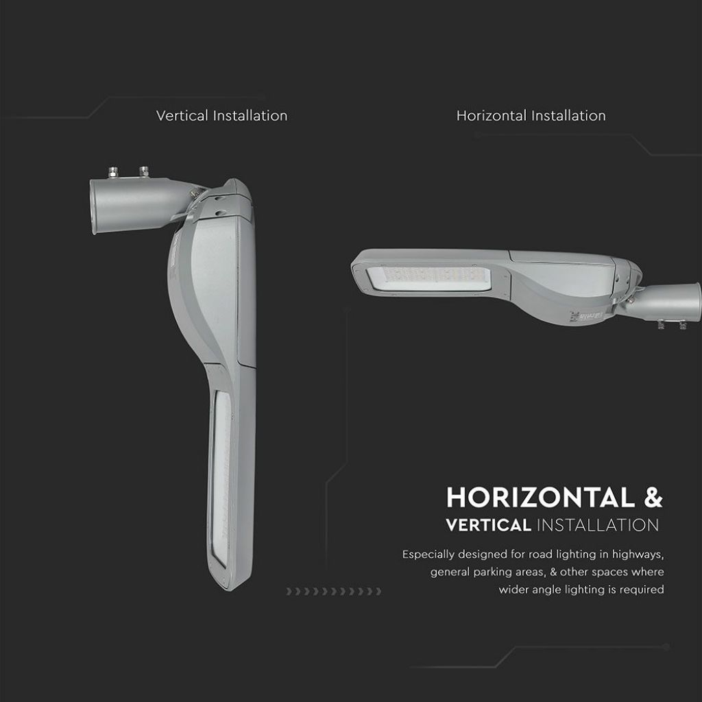 Ideale per installazioni stradali, parcheggi, incroci, aree industriali e logistiche, si adatta a montaggi verticali o orizzontali su pali Ø60mm. Grazie al design compatto da 339x143x831 mm e al peso lordo di 11.4 kg, consente un’installazione rapida e sicura in sistemi di illuminazione urbana e impianti industriali che richiedono elevate prestazioni luminose con consumi contenuti.