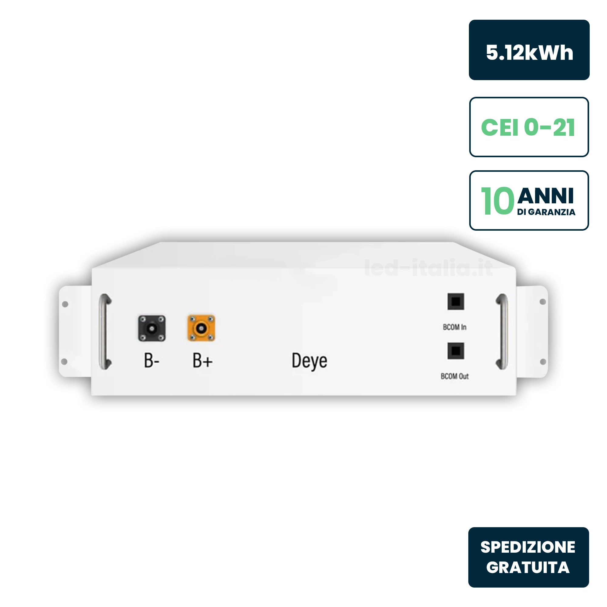 Con una tensione nominale di 51.2V e una capacità di 100Ah, questa batteria garantisce affidabilità e sicurezza. È certificata dalle normative CEI 0-16 CEI 0-21 e dotata di Grado di Protezione IP20.