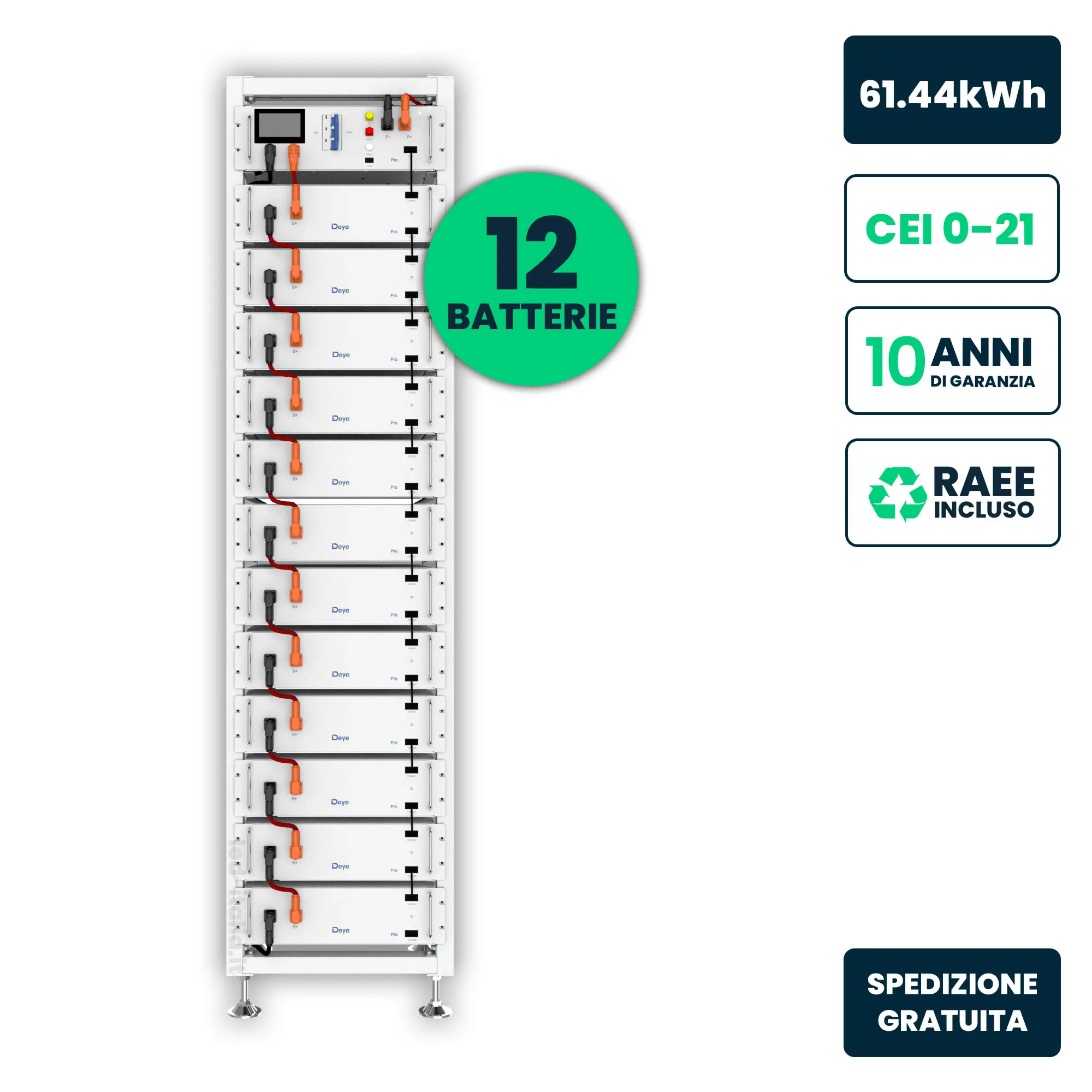 Kit Rack di accumulo alta tensione da 61.44kWh con 12 moduli LiFePO4 da 5.12kWh, HV Box BMS, armadio e cablaggi inclusi. Energia utilizzabile 55.3kWh, tensione nominale 614.4V, >6000 cicli, CEI 0-16/0-21, protezione IP20. Installazione a rack.