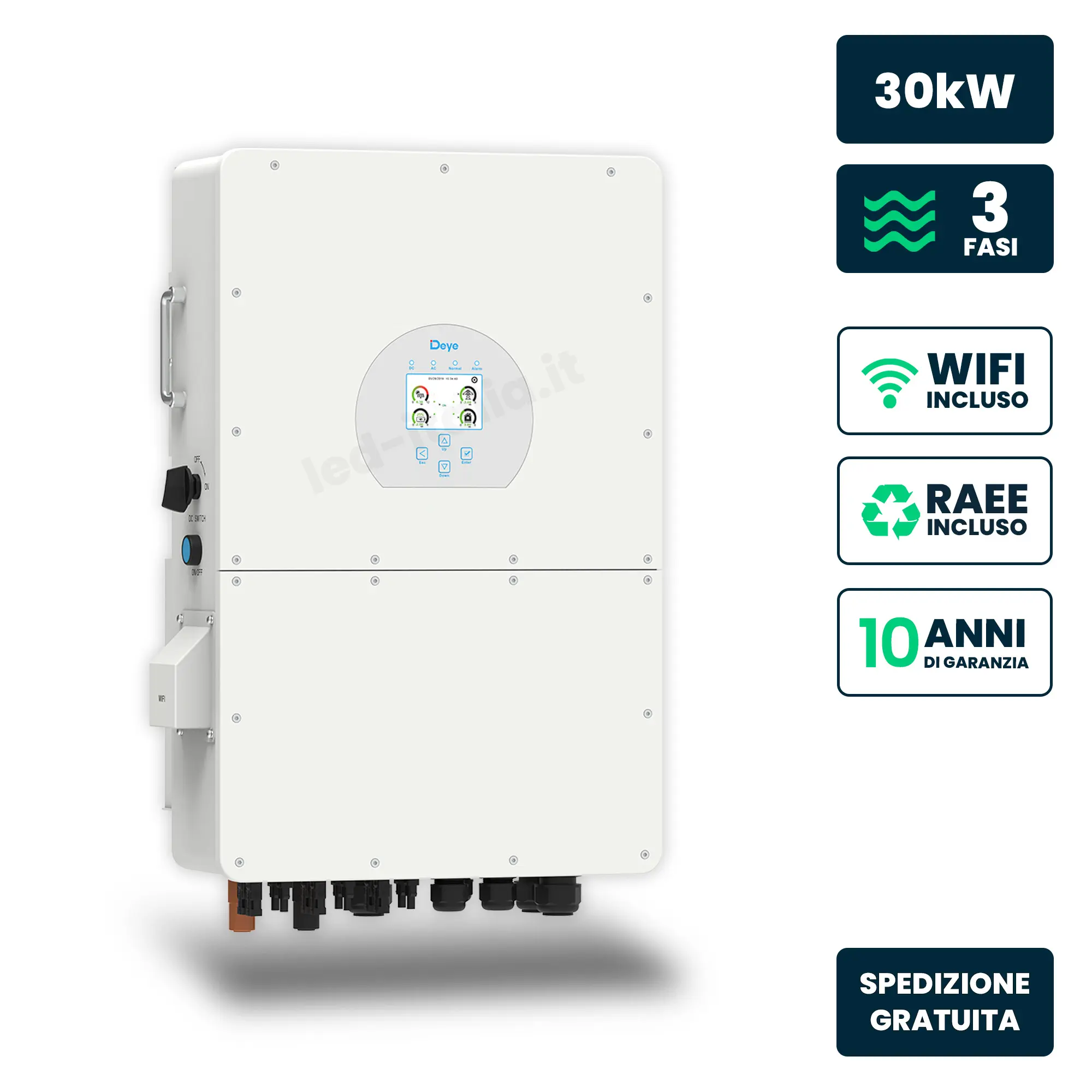 Inverter Fotovoltaico Alta Tensione Deye Trifase Ibrido OnGrid-OffGrid 30kW Triplo MPPT Schermo LCD Touch WiFi e TA Inclusi Garanzia 10 Anni IP65