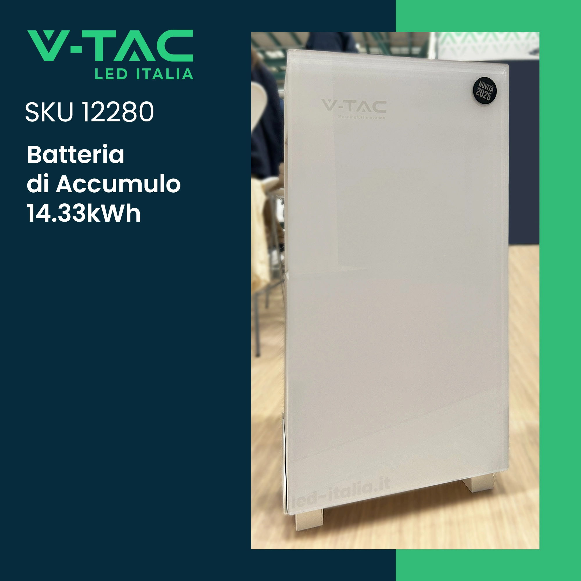La Batteria di Accumulo a bassa tensione (LiFePO4) per impianti fotovoltaici V-TAC SKU 12280 (VT-14336W), con una tensione di 51.2V e una capacità di 280Ah, è progettata per l'integrazione con Inverter Fotovoltaici a bassa tensione (LV), consentendo l'accumulo di energia solare fino a una capacità massima di 14.33kWh. Ideale per migliorare l'efficienza degli impianti fotovoltaici e ridurre i costi energetici.