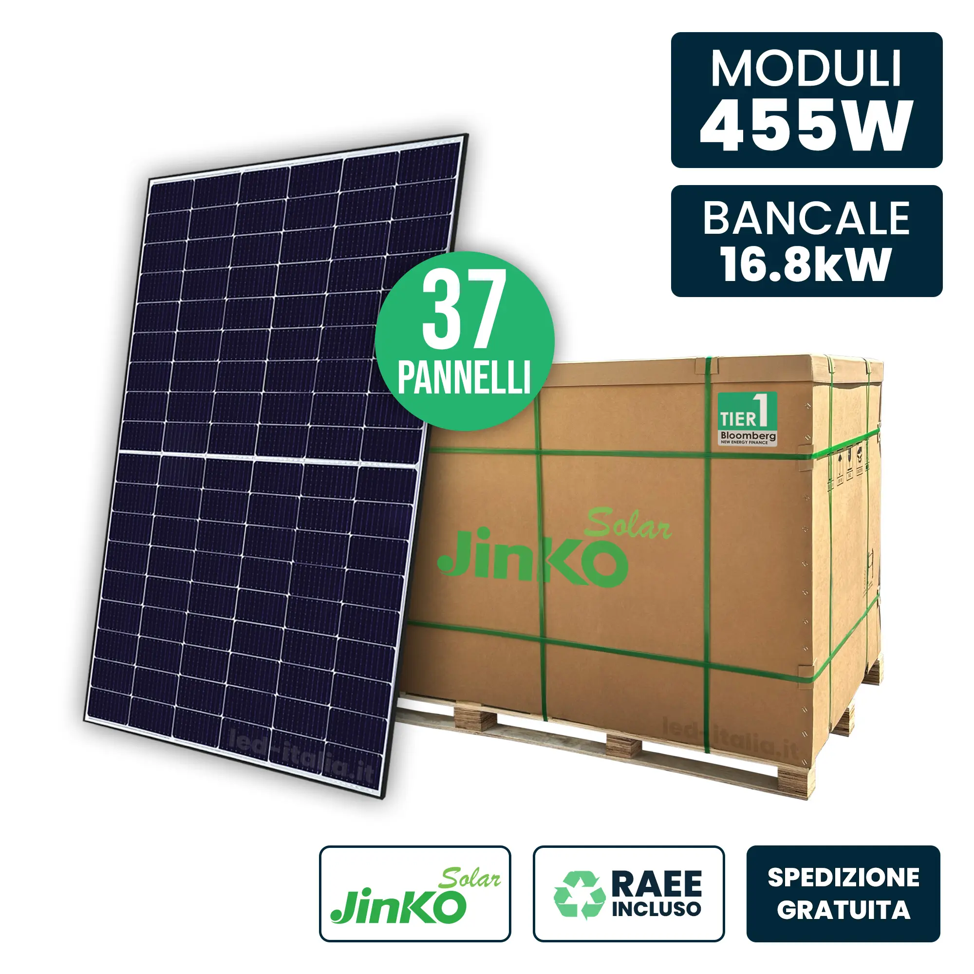 Bancale 37 moduli TIER-1 Jinko Tiger Neo 455W (16.83kW) monocristallini N-Type con TOPCon e SMBB: efficienza 22,77% e resa ottima anche con poca luce. Anti-PID, degrado ridotto, IP68 e resiste vento/neve 6000/4000 Pa. Garanzia 15 anni e 30 anni resa.