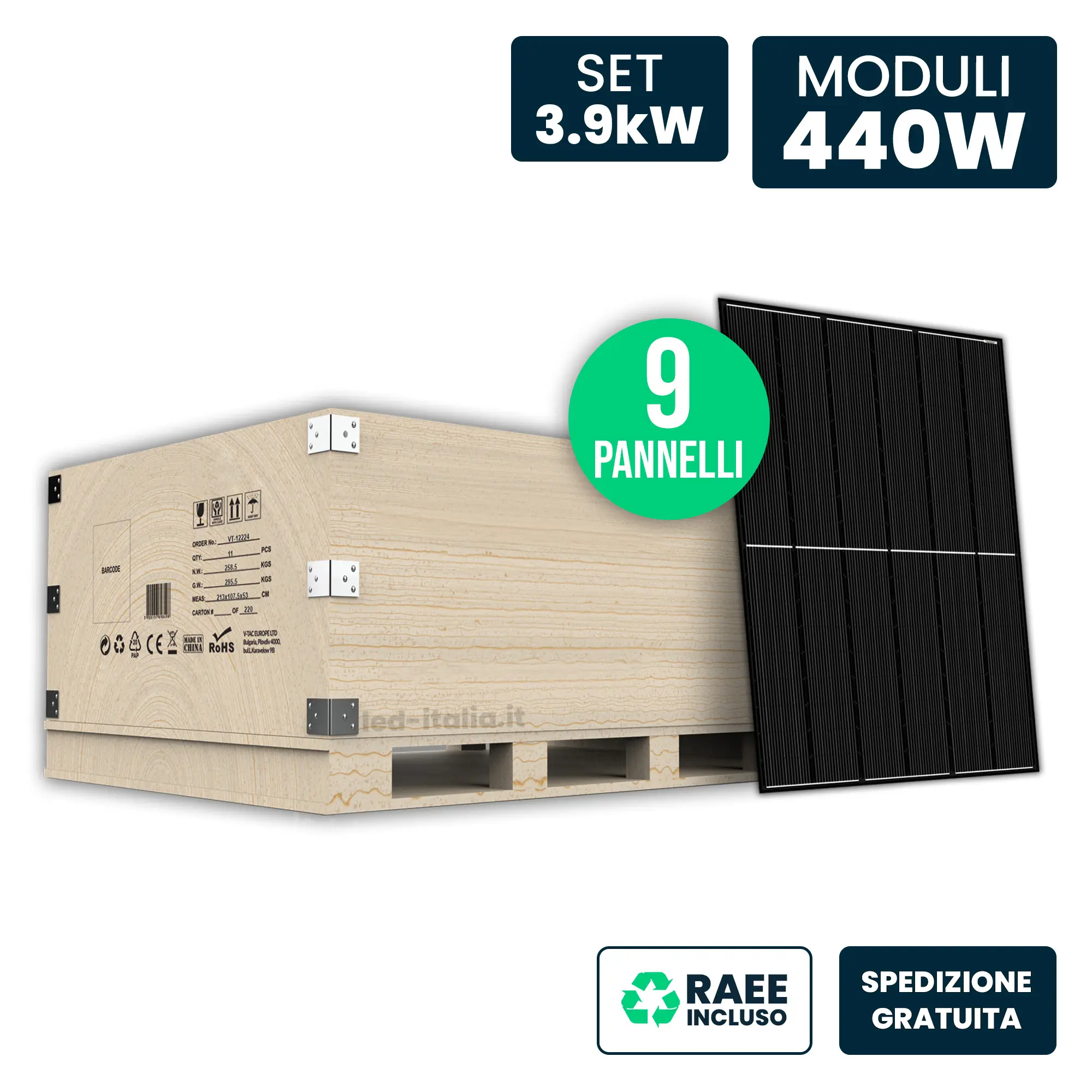 Set da 9 moduli 440W N-Type TOPCon per una potenza totale di 3.96kW. Moduli ad alta efficienza 22,53% con 108 celle half-cut, prestazioni elevate anche con bassa luminosità. Struttura robusta full black, IP68, resistente fino a 5400Pa. Garanzia 20 anni e garanzia lineare 30 anni.