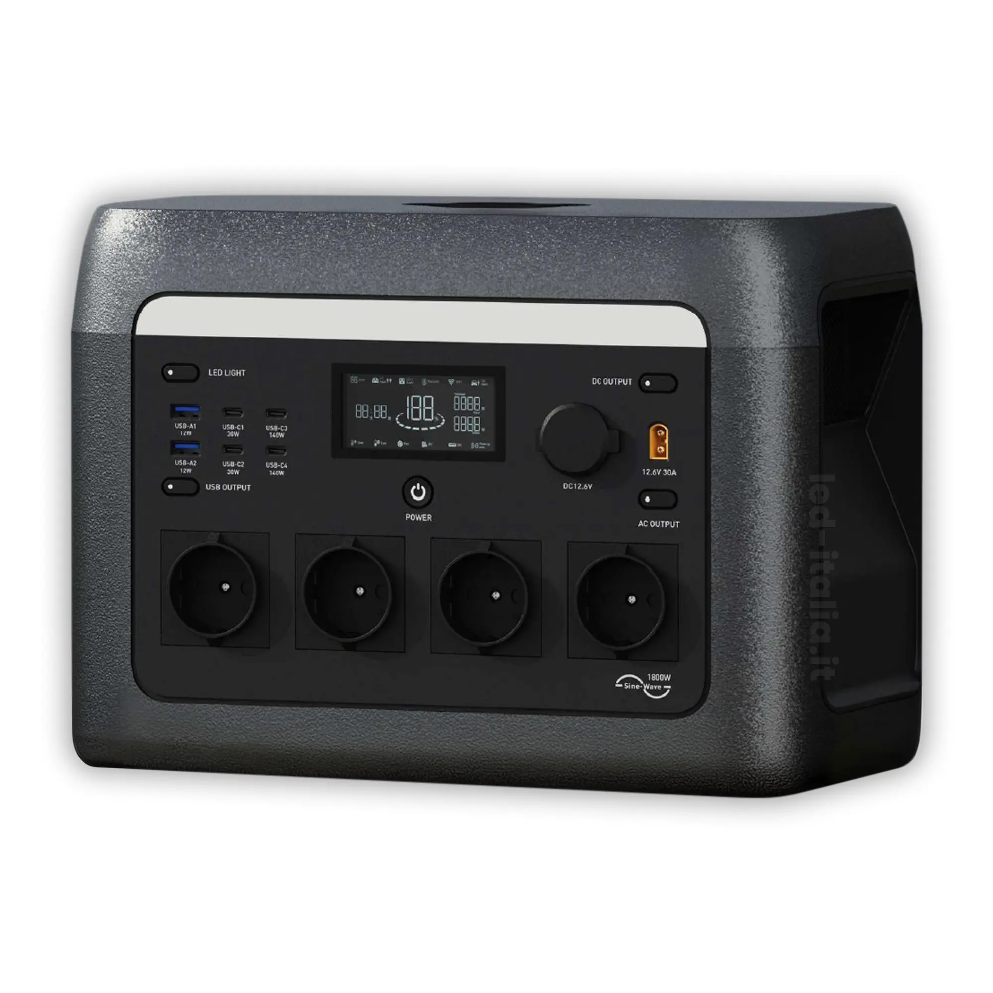 L'uscita AC a onda sinusoidale pura fornisce una potenza nominale di 1800W con picco fino a 3000W, permettendo di alimentare in sicurezza una vasta gamma di dispositivi come elettrodomestici, utensili elettrici, apparecchiature elettroniche e sistemi informatici.