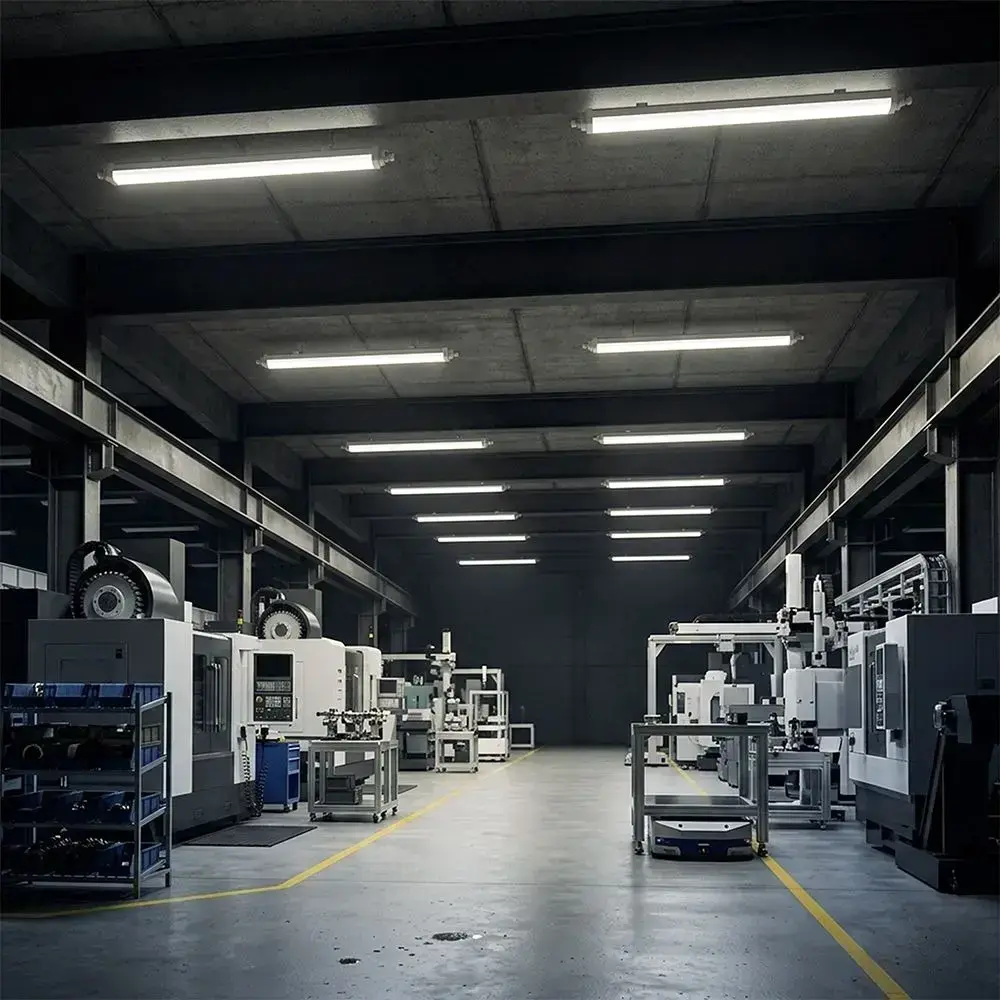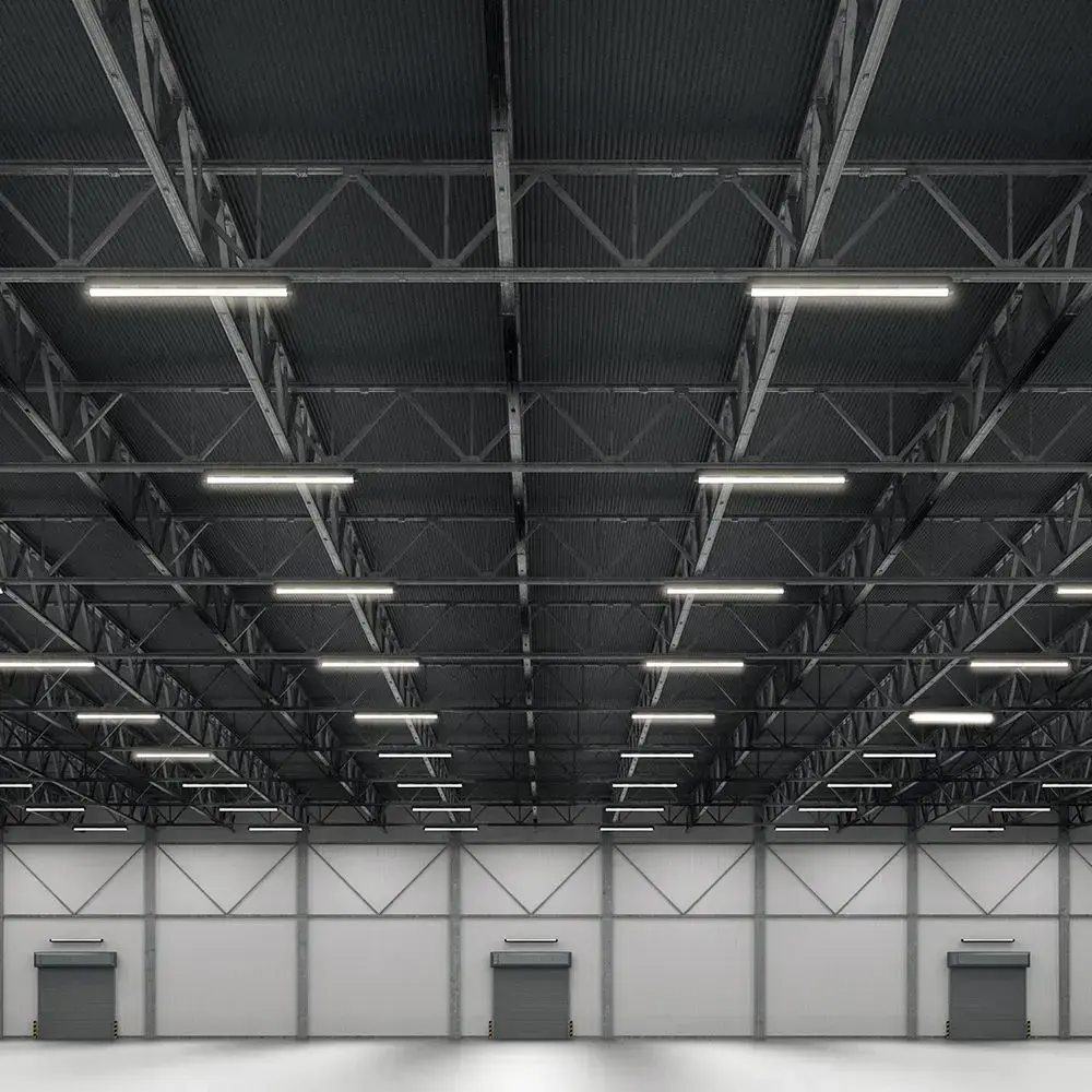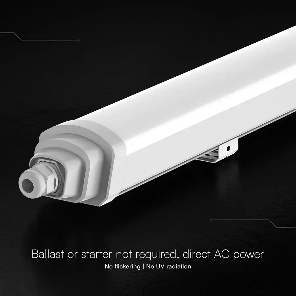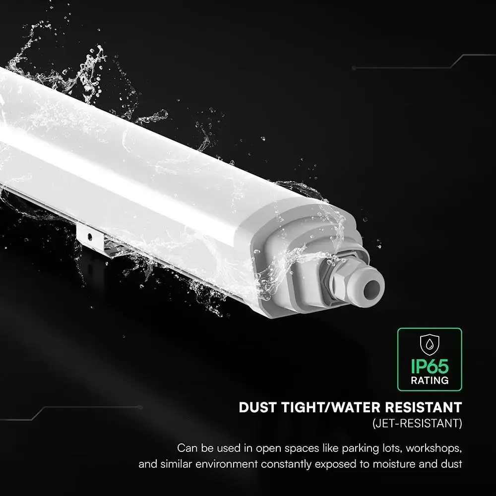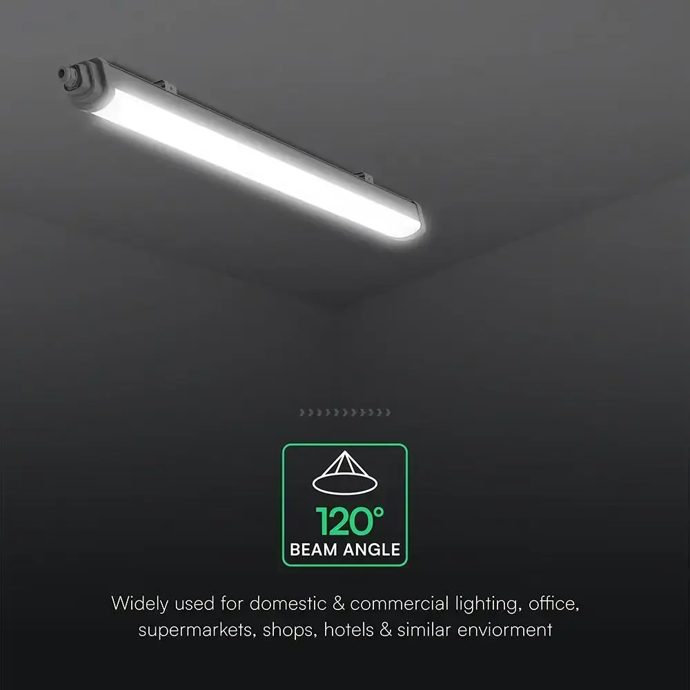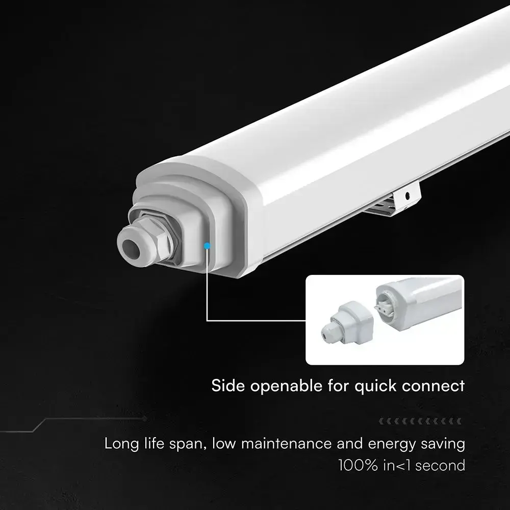Plafoniera LED impermeabile da 48W lunga 150 cm con chip SMD-CREE ad alta efficienza 120 lm/W. Flusso luminoso di 5760 lm con temperatura colore 4000K e accensione immediata. Corpo in PC resistente con protezione IP65. Alimentazione diretta 220-240V senza ballast o starter. Ideale per parcheggi, magazzini, garage e officine.