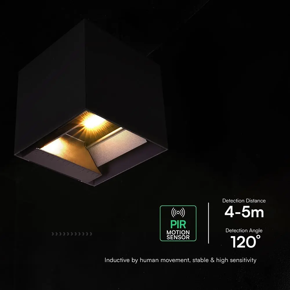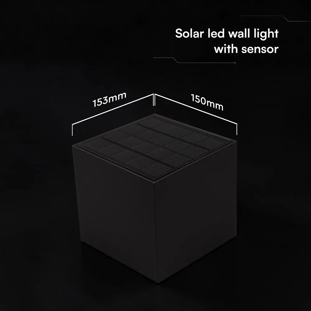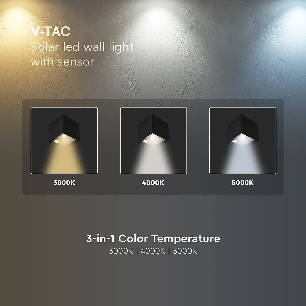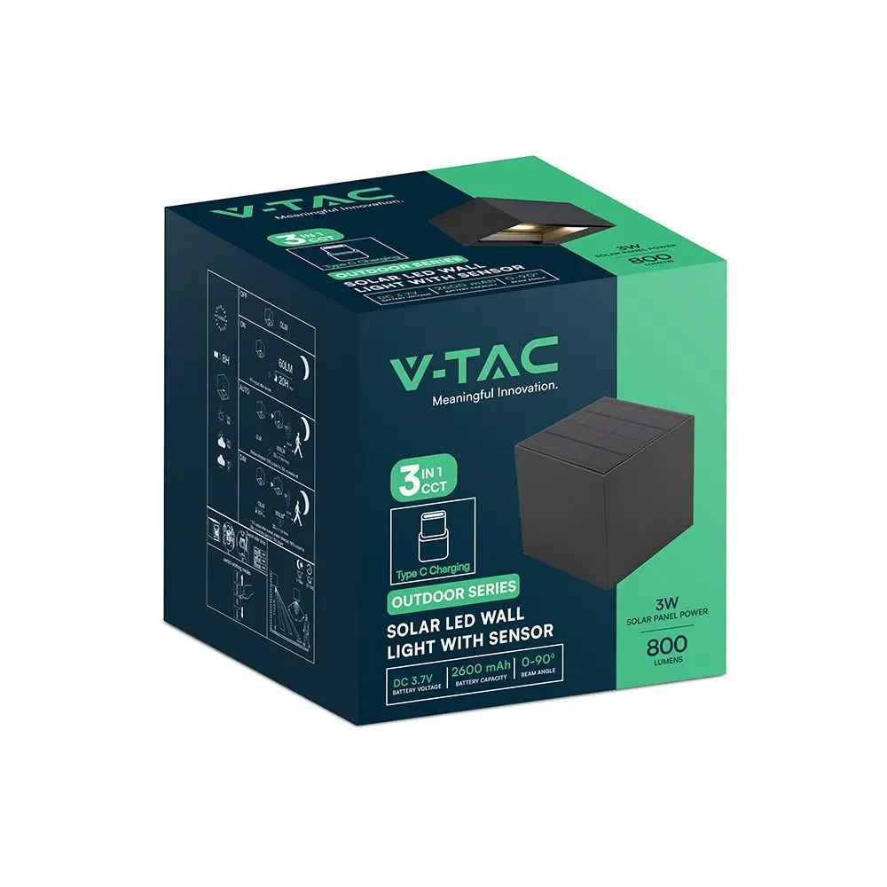 Applique solare LED da parete da 9W con pannello solare da 3W e sensore di movimento PIR con rilevamento fino a 4–5 m e angolo di 120°. Flusso luminoso di 800 lm con temperatura colore CCT 3in1. Batteria Li-ion 2600 mAh con autonomia fino a 30 ore e ricarica in circa 8 ore. Struttura in alluminio e PC con protezione IP65 per installazione esterna.