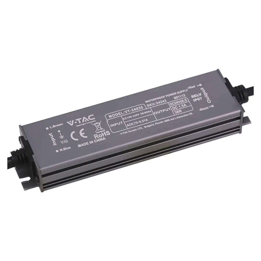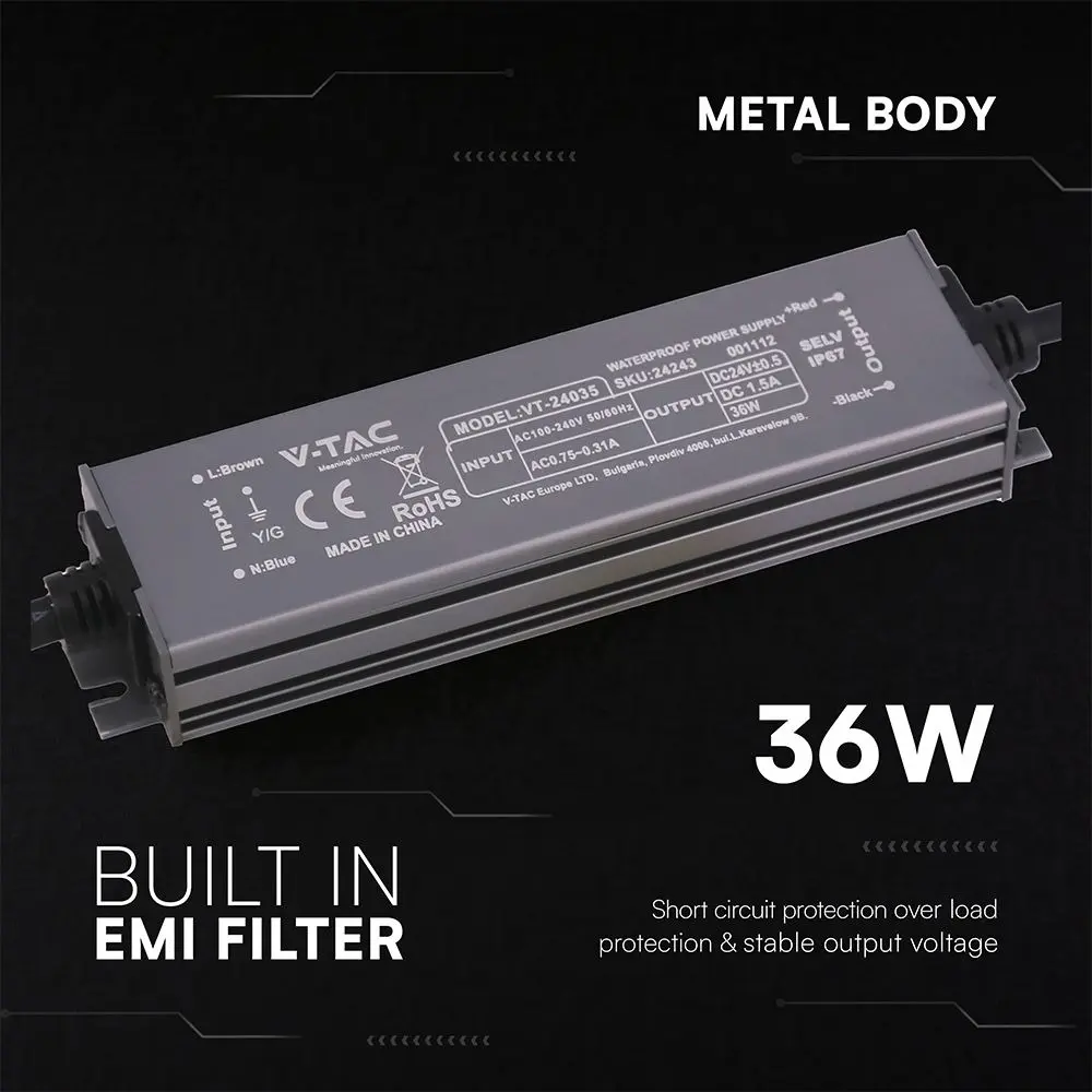 V-TAC Alimentatore LED in Metallo 36W 24V 1.5A con 1 Uscita 140x35x21mm IP67
