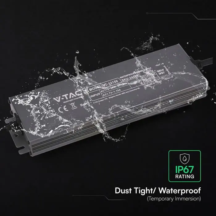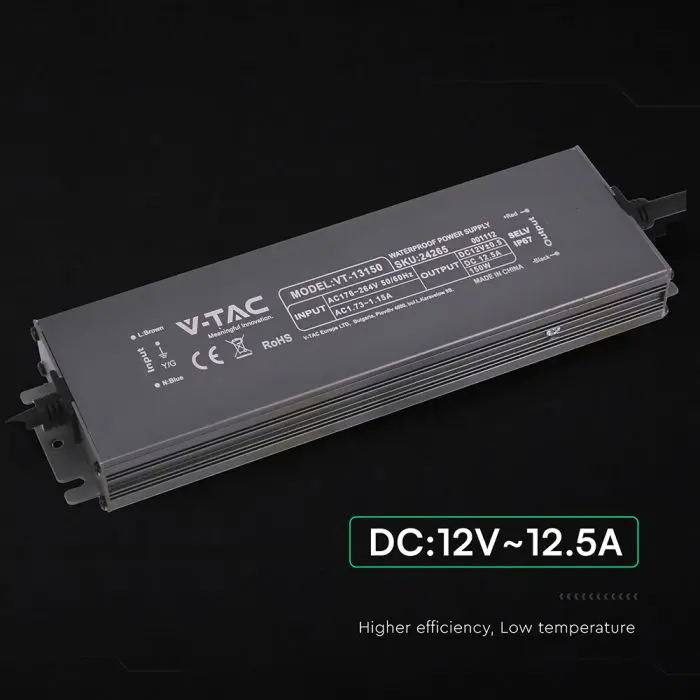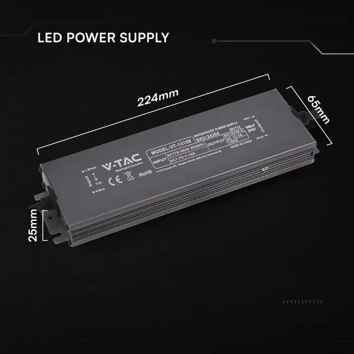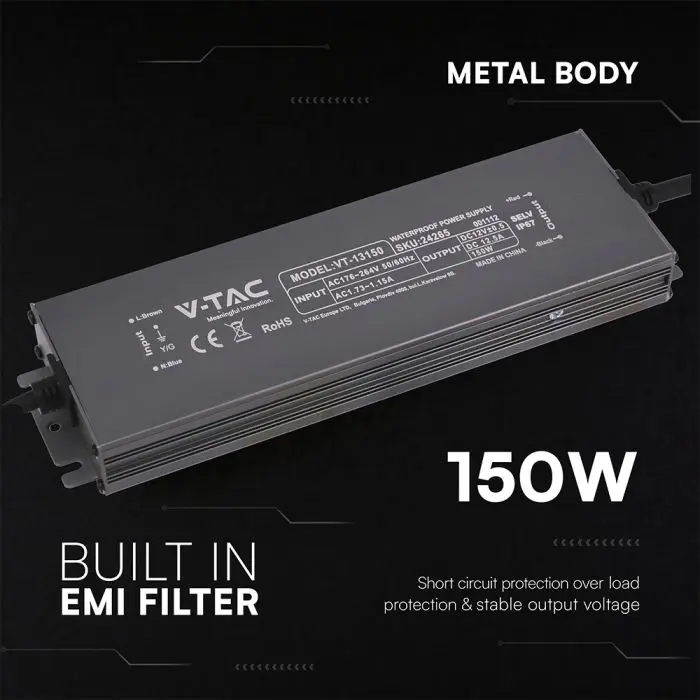 Alimentatore LED a tensione costante 12V 150W (12.5A), ingresso 176-264V AC 50/60Hz. Corpo in metallo nero 224x65x25mm con protezione IP67 per applicazioni esterne su strip LED e display, dotato di protezione da sovratensione 115%-135% (shut off), cortocircuito e filtro EMI integrato per uscita stabile; non dimmerabile, temperatura di esercizio -35/+55°C, durata 20.000 ore.