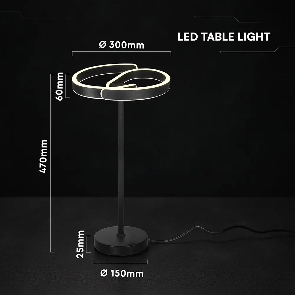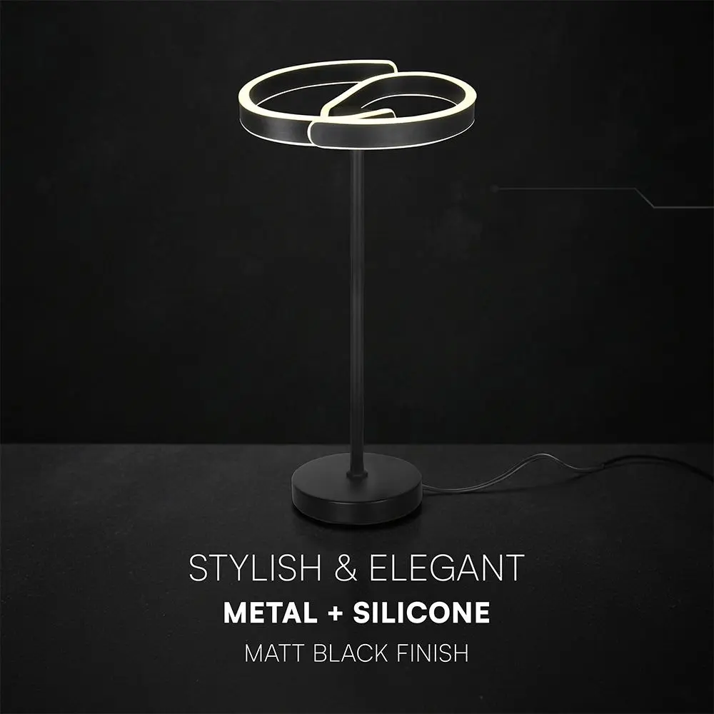 Lampada da tavolo LED decorativa da 25W con temperatura colore 4000K, flusso luminoso 3250lm e CRI>80 per illuminazione ambientale di soggiorni, camere e uffici. Struttura moderna in metallo e silicone con elegante finitura nero opaco e design minimal. Altezza 470mm con diffusione luminosa uniforme.