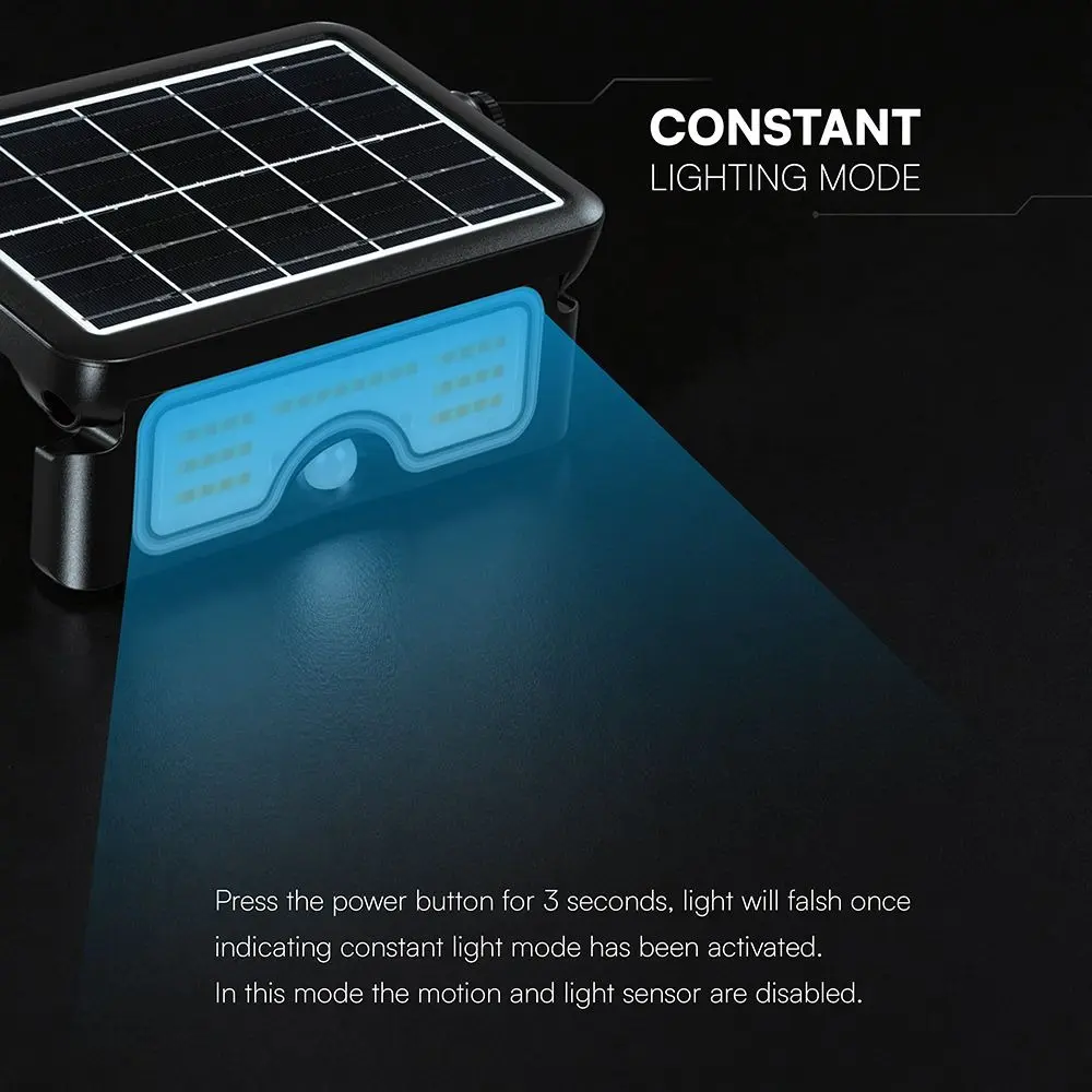 Faro LED solare 7W con pannello fotovoltaico integrato 2.6W e batteria al litio 3.7V 3600mAh. Flusso luminoso 900 lm con selezione 3CCT (3000K/4000K/6500K) e sensore di movimento PIR 120° con portata 2–6 m. Due modalità di funzionamento (sensore o luce continua). Corpo in ABS+PC+Alluminio, IP65 e IK07. Ideale per giardini, vialetti e aree esterne.