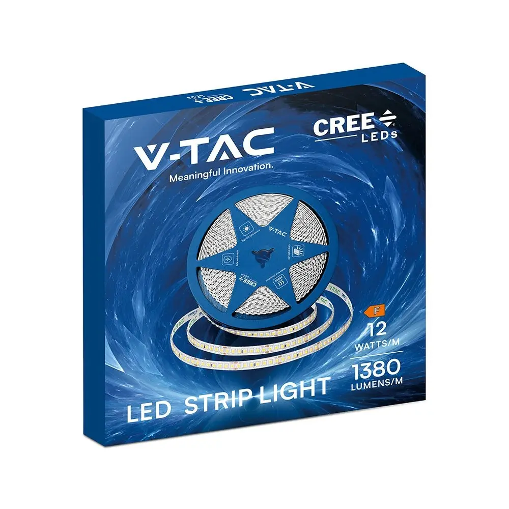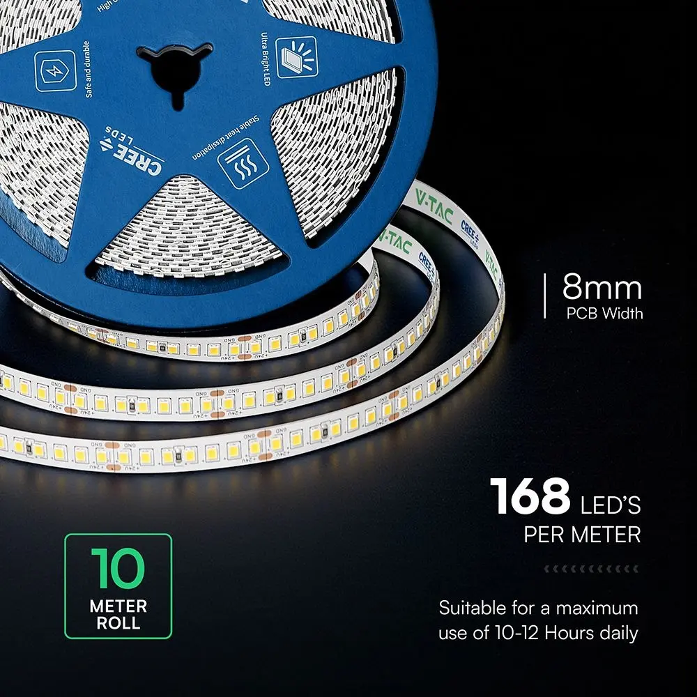 V-TAC PRO Strip LED Chip CREE SMD2835 12W/m 10m 168 LED/m 140LM/W 24V 3000K CRI>90 8mm